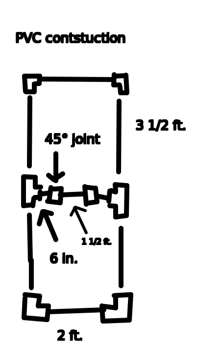 The PVC frame is made out of 1 1/2 in. PVC pipes confitured in the way pictured below, so when dissasembled you end up with 7 3 1/2 peices, the PVC is held together with PVC cement.
